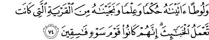 And to Lot We gave judgement and knowledge, and We saved him from the city that was committing wicked deeds. Indeed, they were a people of evil, defiantly disobedient.